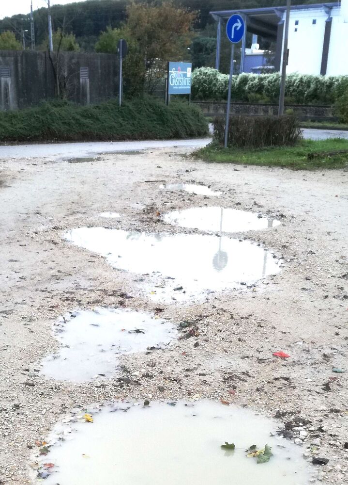 Viele Monate wurde der geschotterte Parkplatz am Strut-Stadion als Materiallager für diverse Tiefbau-Baustellen in der Stadt genutzt und war dadurch nur sehr eingeschränkt nutzbar. Inzwischen ist der Platz wieder geräumt aber in einem katastrophalen Zustand mit tiefsten Schlaglöchern und Mulden, so dass ein gefahrloses Befahren eigentlich nur noch mit SUVs möglich ist. Und auch das fußläufige Erreichen des Fahrzeugs ist für die BesucherInnen des Stadions und der Gaststätte eine Herausforderung.